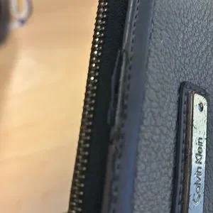 This is a Calvin Klein the face plate has scratches. Last picture shows a little bit appealing on the top of the zipper -zips around the wallet.