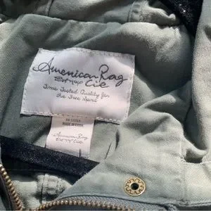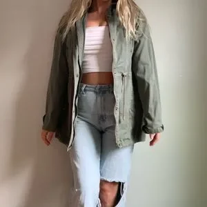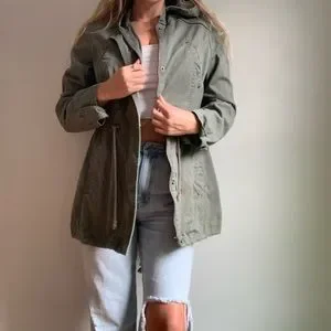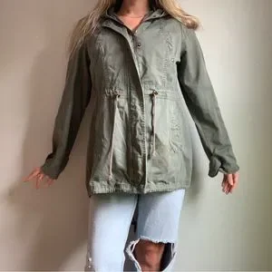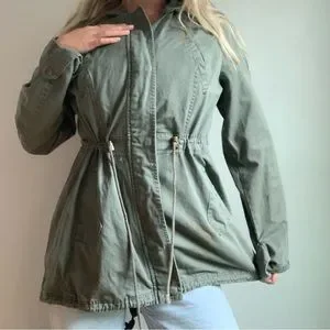 Super cute light weight fall zip up jacket with hood. 100% cotton. Cinchable at waist. Stain on front left portion of jacket. See photos. Priced accordingly. Still lots of life in item for some w/ a creative mind! Army jacket. Utility jacket. Khaki jacket. Cotton jacket. Fall coat.