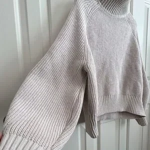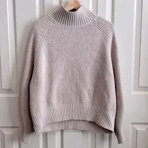 Women’s mock neck sweater. Perfect for the cooler weather. It’s not too heavy, slightly hi-low style, small mark on sleeve (pictured) doesn’t affect functionality.