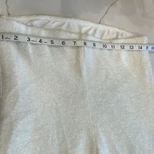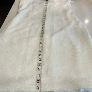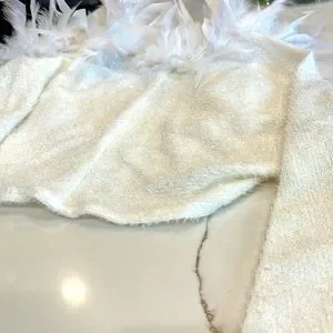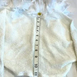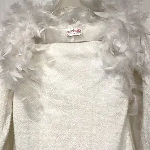 Carabella shimmery strapless dress with shrug that has white feathers. Cute for the Holidays. Fully lined. Large. Dry clean only. 95% Polyester and 5% Spandex. Dress has elastic around the entire top of the dress. Some of the photos do not show correct color. It’s Snow White the material on both pieces has a sparkle.