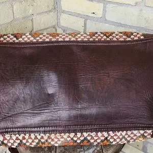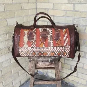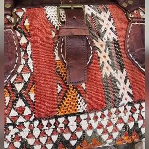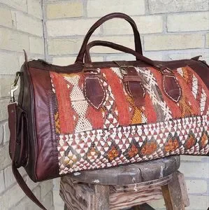Turn heads at the airport or on your next weekend getaway! This handmade leather & kilim duffel bag is stunning and functional! Never used, but has a worn in Bohemian vibe to it... Zippered top closure w/buckle, side patch pockets with buckles, removable carry strap... no interior pockets... I believe this was made in Morocco 🍁