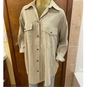 This is the oversized shirt in light green-beige. The color of similar to a pale sage and does has a slight tint of taupe to it. It features a turn-down collar, buttons at front, yoke at back, and chest pockets with flap/button. Can be worn as a lightweight jacket or buttoned up as a regular shirt.