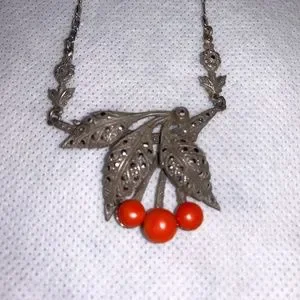 Vintage coral sterling silver cherry necklace. Marked sterling silver on back of necklace. Missing small stone on left leaf at the top. It’s hardy noticeably and doesn’t take away from this beautiful necklace. When I purchased this necklace it was sold to me as coral. I’m not a jeweler and don’t know 100% if the cherries are coral.