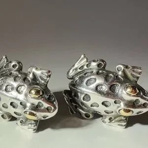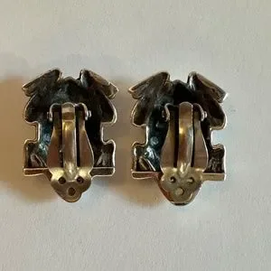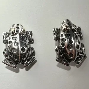 Dian Malouf Sterling Silver Frog Earrings with 14K Gold Eyes. Clip backing. 1.25" long.