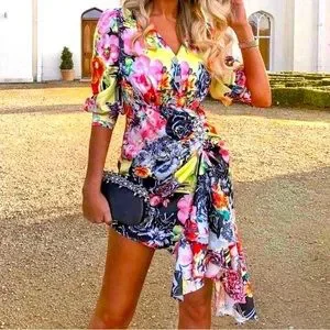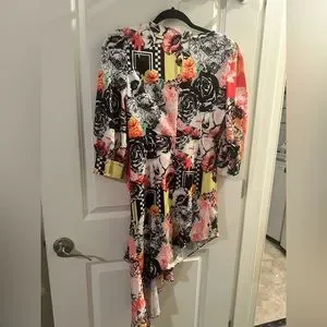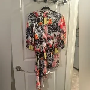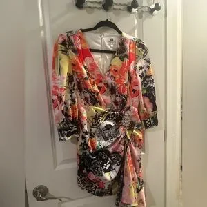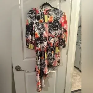 Comino Couture London Drape Silk Designer Dress. Beautifully unique pattern and design with faux diamond brouche and buttons details. Asymmetrical, slight puff to the sleeve & drape detail. This dress is a showstopper, great for a girls night out, party, or any event that you want to stand out in. No longer available online and retails for $199. Asking $100 OBO. Only worn once for an event & received so many compliments. Please check sizing! UK 8, is a small US size 2/4. Please DM me if you have any questions and be sure to check out my other items, everything must go!