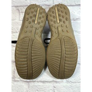 Overall clean and minimal wear for lots of life yet in a comfy and casual shoe that elevates your outfit beyond basic sneakers. This pair is two toned with chocolate feature a dual tan stripe. Mens size 8.5