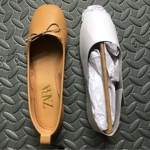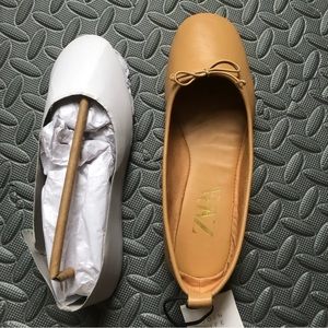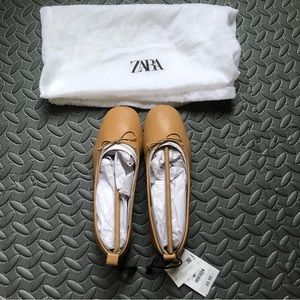 NWT Zara Leather Ballet Bow Tie Ballerinas Flats Shoes Beige Size 7 / 37