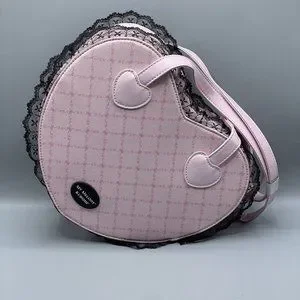It doesn't get more kawaii than this! Kuromi and My Melody are dressed up in Lolita-inspired fashion and are featured on this large heart-shaped figural bag. Comes with black lace and bow details under the strap, interior zipper pocket and two bag straps.