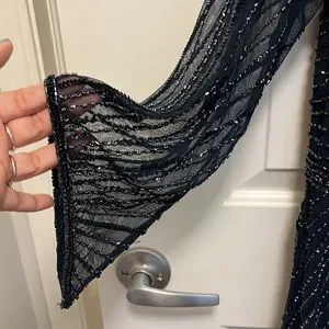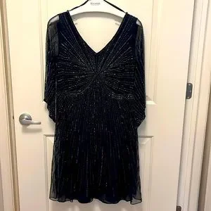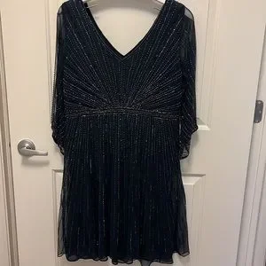 Purchased this season at Macy’s for $300 worn once to a wedding. In perfect condition, every bead is intact. Very comfortable. I am a size 12 and it was perfect with a bit of room. Pit to pit is 20.5, shoulder to hem is 39. Sleeve is 3/4 length. Dress has a sheer lining and a slip.