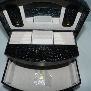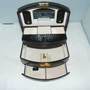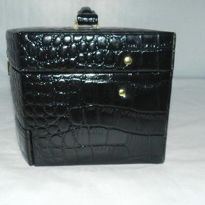 JW London Jewlery Case Black Moc Croc, 3 tier, with key, approximate measurements side to side 8.7", about 6 deep (front to back), about 4.8" high, new without box, please ask if you have questions