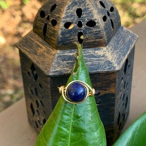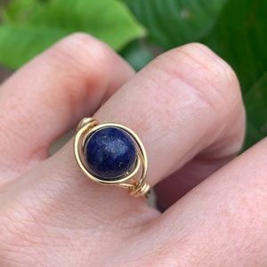 Unique rounded lapis lazuli stone handmade ring. Wire wrapped with golden non-tarnish wire. Ring is a size 6 and can be made in other sizes. See pics for up close detailing. Pre order stone may vary slightly in details as natural stones are unique.