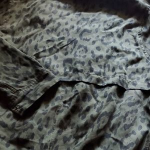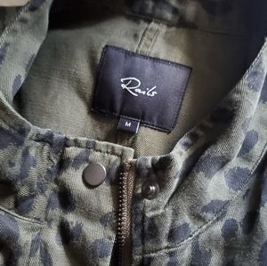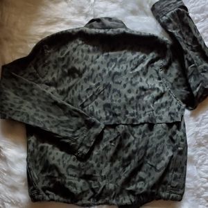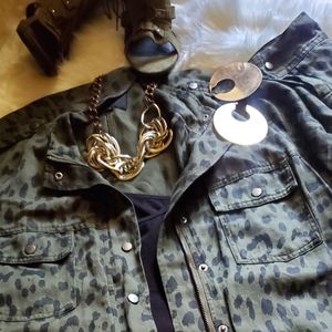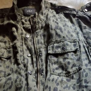 Army Green and Black Leopard print utility drawstring waist jacket front Snap button and zipper detail