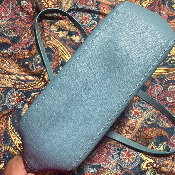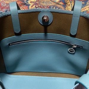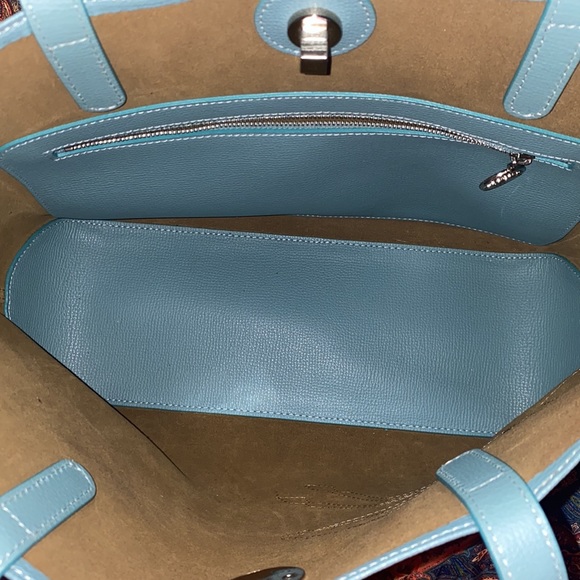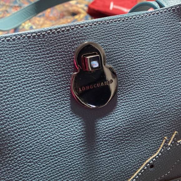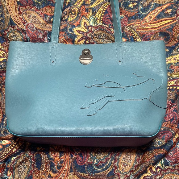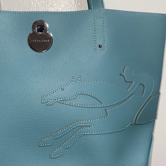 Pristine light blue leather Longchamp tote with silver square lock, never used.