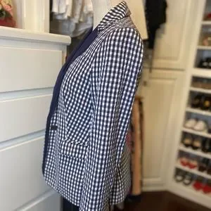 JCrew Blue & White Gingham Blazer with navy blue lapel, single front button closure, two front flap open pockets, back bottom slit and sleeve with four button cuff, fully lined. Jacket can be dressed up or down.