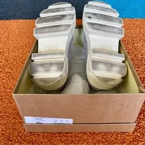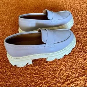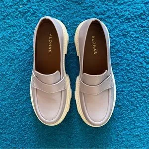 Super cute platform loafers with white soles! Only worn a few times; in excellent condition with some dirt on soles. Per Aloha, made with sustainable leather. Heel height is 2.2 inches. Size 38.