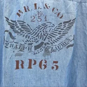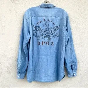 Polo Ralph Lauren Vintage Denim Jean shirt. Long sleeve button down distressed blue chambray shirt. Light medium blue wash. Cool Moto motorcycle Print on front and back. Front shows PRL 5 with arrows. Back shows P.R.L. & Co No. 251 and RP 65. With big Eagle and Ralph Lauren banner in vintage dark weathered red box font and print. Roll up sleeves, wrist buttons, elbow stitching. COTTON