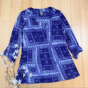 Anthropologie Delft Stamp tunic shirt by One September, size small. Beautiful blue and white pattern print with roll tab sleeves. Very good gently loved condition. Bust measures 19 inches across, length 27 inches. Super soft and dreamy.