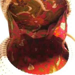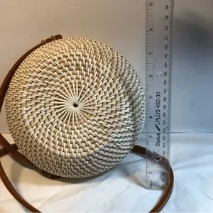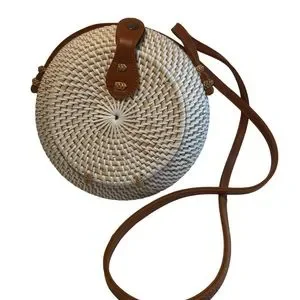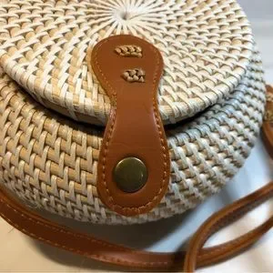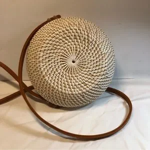 Round Rattan Bag White Handmade Crossbody Bag with Synthetic Leather Straps