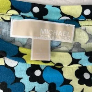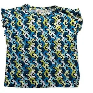 Adorable floral t-shirt from Michael Kors. Softly ruffled cap sleeves. Soft cotton blend fabric. This was washed and is clean and in excellent condition. But it may have shrank slightly. Tag says size large but IMO may fit more like a medium. Super Cute!