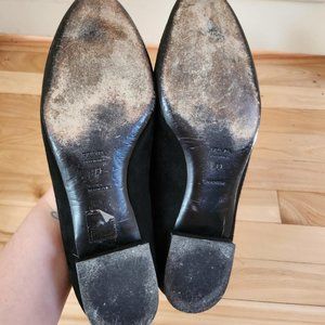 Black suede Prada flats with stacked heels. Their is a little scratch in the velvet at the front and the sole is pretty used but other wise they are in good shape.