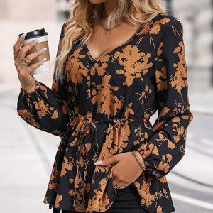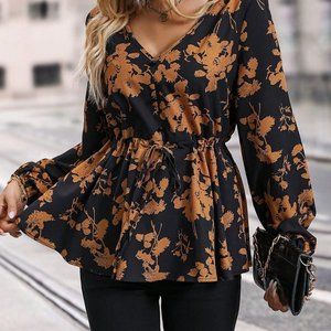 Black & Brown Preppy Womens Floral Print Lantern Sleeve Knot Front Peplum Blouse