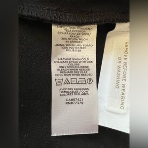 This dress is a double knit fabric with a zip back and lined bodice. Machine washable. Length measures 37” from neck back to hem. Great LBD!