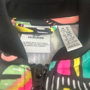 Colorful girls track jacket, perfect for a cool day. Bright colors pop off of a black background, reminiscent of the 80s. Black 3-stripe classic look on the sleeves.