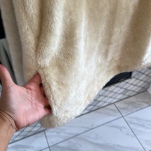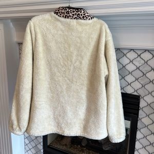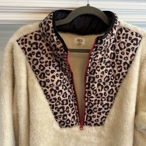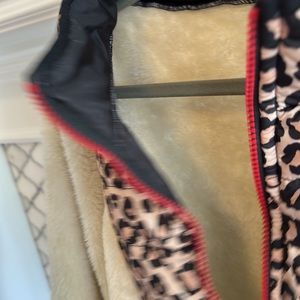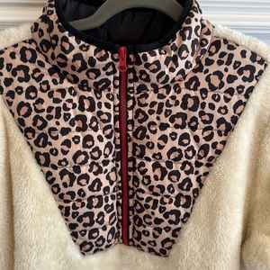 Cream colored sherpa with leopard print bib and red zipper. Size XL, Buckle, great condition, really warm.