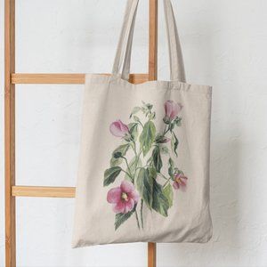 Our designs are printed in-house on sustainably grown and ethically harvested US cotton. This botanical tote features VTG American watercolor art of blooming Sabatia angularis wildflowers, a biennial flowering plant in the Gentianaceae family. The flower blossom petals are depicted in varying shades of pink and yellow surrounded by green leaves. It's native to eastern and central North America and common names also include rose pink, square-stem rose pink or rose gentain.