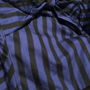The top is strapless in blue and black stripes accented with a bow at the front, and the shorts are solid black with two side pockets. Belt accent not included