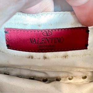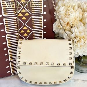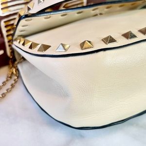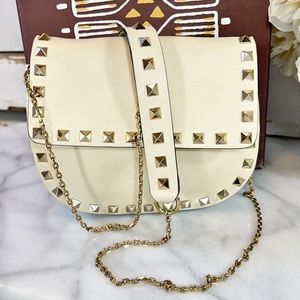 Authentic Valentino Garavani Mini Rockstud Shoulder Bag crafted from Ivory calfskin leather and gold toned hardware. It features a rock-studded chain strap and is lined in gold rock studs. It unsnaps to a suede lined interior with 1 slip pocket. The interior has minimal staining. Please see photos for condition. Replacement rock studs & dust bag included.