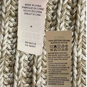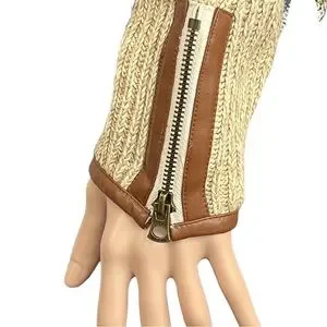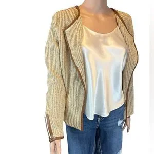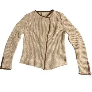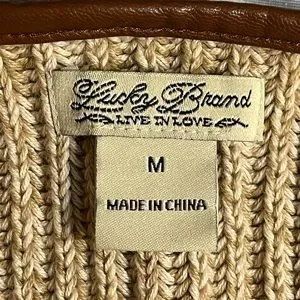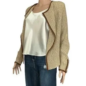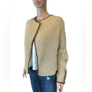 This tan and cream knit open front sweater by Lucky Brand is edged in brown vegan leather up each front and around the neck. The wrists have zipper for added touch and are also lined in leather. It appears this cardigan has not been worn because the Please Remove tag is still attached (see last photo). Approximate measurements were taken flat and listed below: