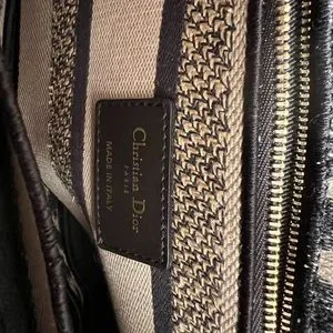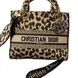 The Lady D-Lite bag combines classic elegance with House modernity. The style is fully embroidered with a beige and black Mizza motif, inspired by a leopard pattern from the House archives. The front features a Christian Dior Paris signature while the thick D.I.O.R. charms in pale gold-finish metal further enhance the silhouette. Equipped with a wide, reversible and removable embroidered shoulder strap, the medium Lady D-Lite bag can be carried by hand or worn crossbody.