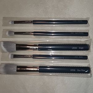 Laruce Beauty Christine makeup brush set. Includes a fiber cheek brush, a small angled cheek brush, a small concealer brush, a small flat shader brush and a medium domed blending brush. Comes in a graphite petite renne cup. NWT!