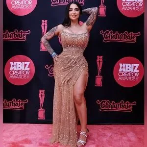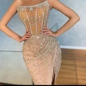 High End Gorgeous Crystal Champagne Side Slit Dress