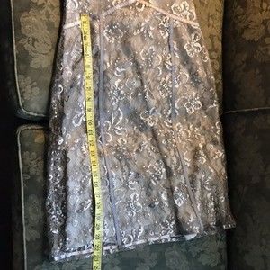 Beautiful formal dress, perfect for wedding or cocktail hour. Extra sequins attached. Hidden side zipper. Color is a pretty silvery green with sequins attached to lace.