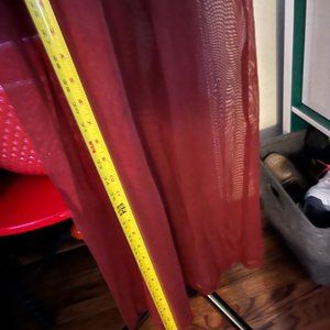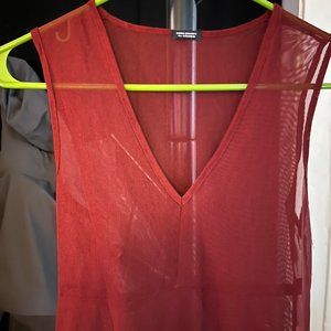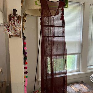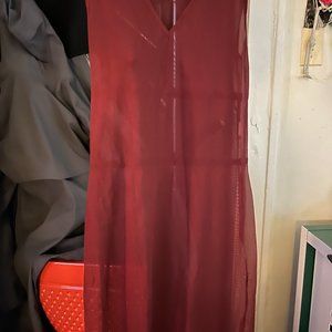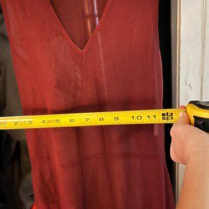 this is gossamer fitted mesh and so on trend, love this thing but didn't wear it much so....rough measurements (stretches but not too much in some places like the waist), 26 waist, bust is 30 but stretches well to 34 inches. It's between a midi and maxi, the length is 47ish from top of shoulder to bottom. the cut is fairly straight (not aline) bit very bendy for movement. this is Small to extra small.Very gender fluid, easily killer styled. Very durable peice, which I look for bc I traveling a lot.Tags are illegible due to vintage-ness, it's poly gossamer mesh. Hand washable, easily packable, amaze-nawls. it's a burgundy-reddish color. I bought this is the nineties for the same amount as my rent :) Price firm.