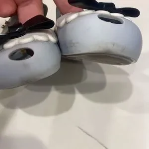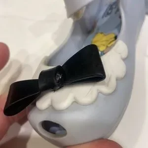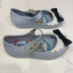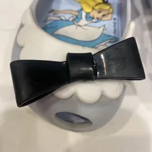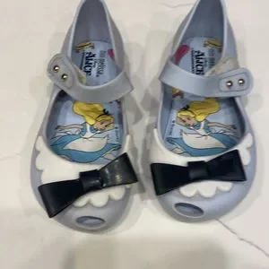 Mini Melissa Alice in Wonderland Mary Janes size 8. Blue with a black bow. Good overall condition. One black bow was separating and it has been glued. Please see all pics. Straps still stick tight. Smoke free home