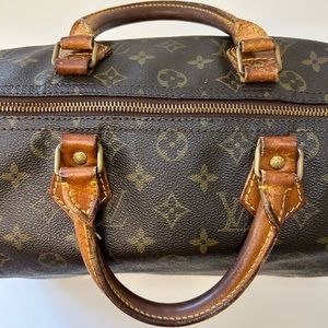 Authentic Vintage Louis Vuitton Speedy size 30 in the classic monogram canvas. The vachetta is a deep honey patina throughout, moderate scratches, stains, and cracks. The handles have darkening and cracking. Leather trim has some scuffing. Leather zipper pull is still intact but has a mild crack. The canvas is in good condition, mild fading and one minor crack near zipper. All the hardware is in tact, zipper functions excellently. Interior lining is in okay condition, some staining and rip near pocket. The small pocket has begun to degrade/get sticky (common issue with LV bags). The date code is 834 SA, indicating the bag was Made in France April 1983 . Does not come with dustbag or original receipt, comes with original lock and key. Overall good condition for age.