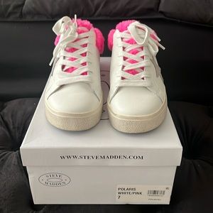 Steve Madden Polaris sneaker. Leather exterior with hot pink faux fur lining. Lace up front. Side suede star. New in box
