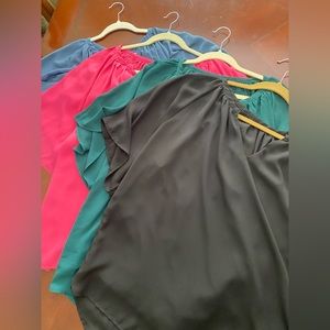 FOUR like new chiffon blouses - all 4 colors shown. Loved this too so much, 4 colors were purchased! Size 2X, loose enough to fit 2x-3x (see size chart). Flowy, high-low feature with front lining, easy to dress up or down, LIKE NEW - worn a few times only before she lost weight and had to order more in a smaller size.
