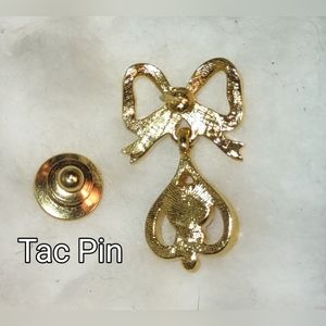 Bright and shiny goldtone bow with faux pearl center takes on a Victorian flair with this iconic 1970s tac pin.