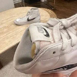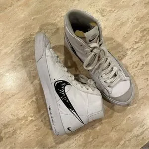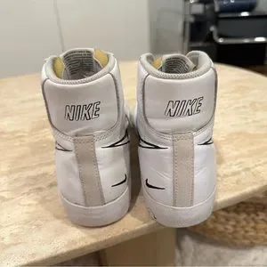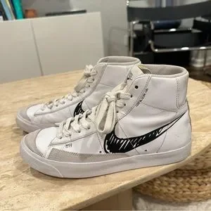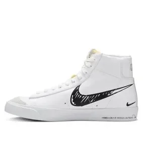 The Nike Blazer Mid 77 Sketch White Black features white leather and suede uppers, with the smooth leather in white shades covering most of the construction. From there, the characteristic Swoosh branding goes for a more unfinished, printed-on look and "1977" text combines with tan accents around the tongue to complete the design.