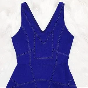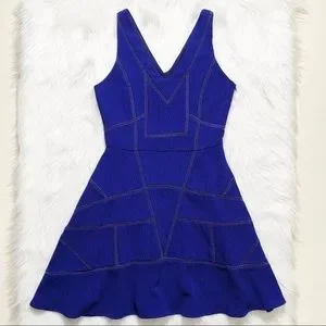 Anthropologie, Greylin blue eyelet embroidered fit and flare sleeveless dress. Cobalt blue with tiny geometric royal blue geo pattern eyelet detail throughout. Front and back V neck, fitted top, seamed waist, appx knee length A line skirt. Medium weight textured crepe fabric, semi stretch poly/spandex blend, fully lined (eyelets are lined, not see-thru), pulls over, hidden side zipper.