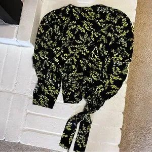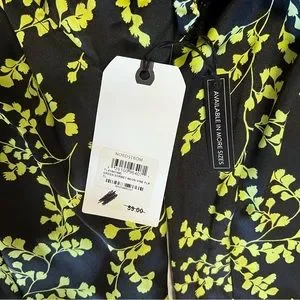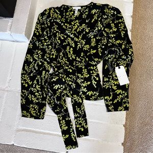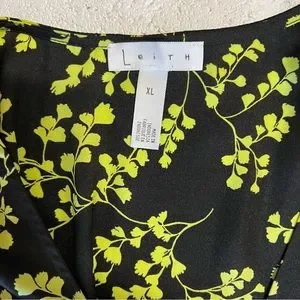 Leith brand blouse. Long sleeves. Floral pattern, lime green on black background. Has a long tie. Size XL. Length is 21”. NWT. Good condition. No flaws.