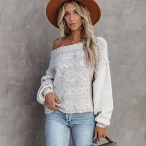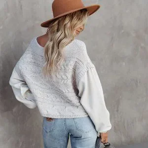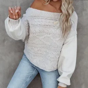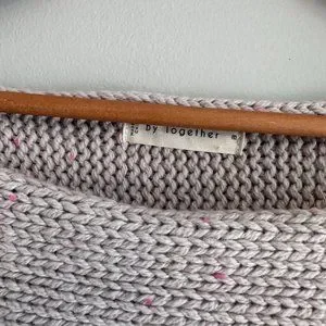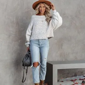 This sweater is light grey with pink speckles. Designed with a wide neckline and long contrast sleeves. Finished with drop shoulders.