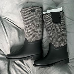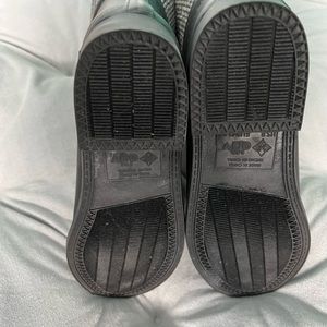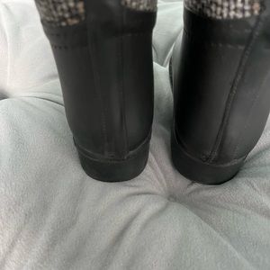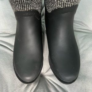 DAV Inverness weatherproof black boots. Has 1 inch heel. Measures 15.5 inches including heel. Patterned fabric shaft. Has a stretch insert on inner upper portion. White fleece lining. Like new, maybe worn once.