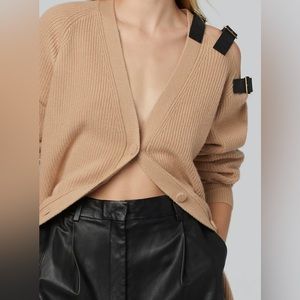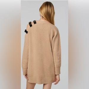 In stark contrast to its softness, a row of metal buckle straps-a signature detailing the garment's cold shoulder.