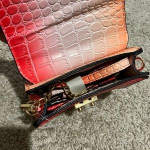 Small snake skin looking leather bag in shades of pink and orange ombré. Brand new and comes with longer strap for cross body