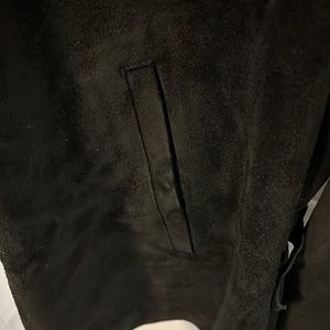 This jacket is black suede with a full zip up front. The waist has back adjustments. The inter liner is a soft cotton. It is very warm and good for three season wear. Leather is in excellent condition and the jacket has only been worn a couple of times.